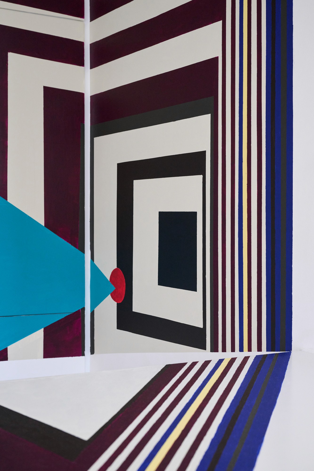The three-dimensional surface of the construction aims towards the idea of the realisation of space as a material in itself, treating the architecture of the kitchen not as a series of boundaries, but as a single continuity, from vertical to horizontal without interruption. From a single point in the room the abstraction resolves into a complete image – it reveals itself as anamorphic, withholding its full logic until the body finds the exact position from which everything aligns.